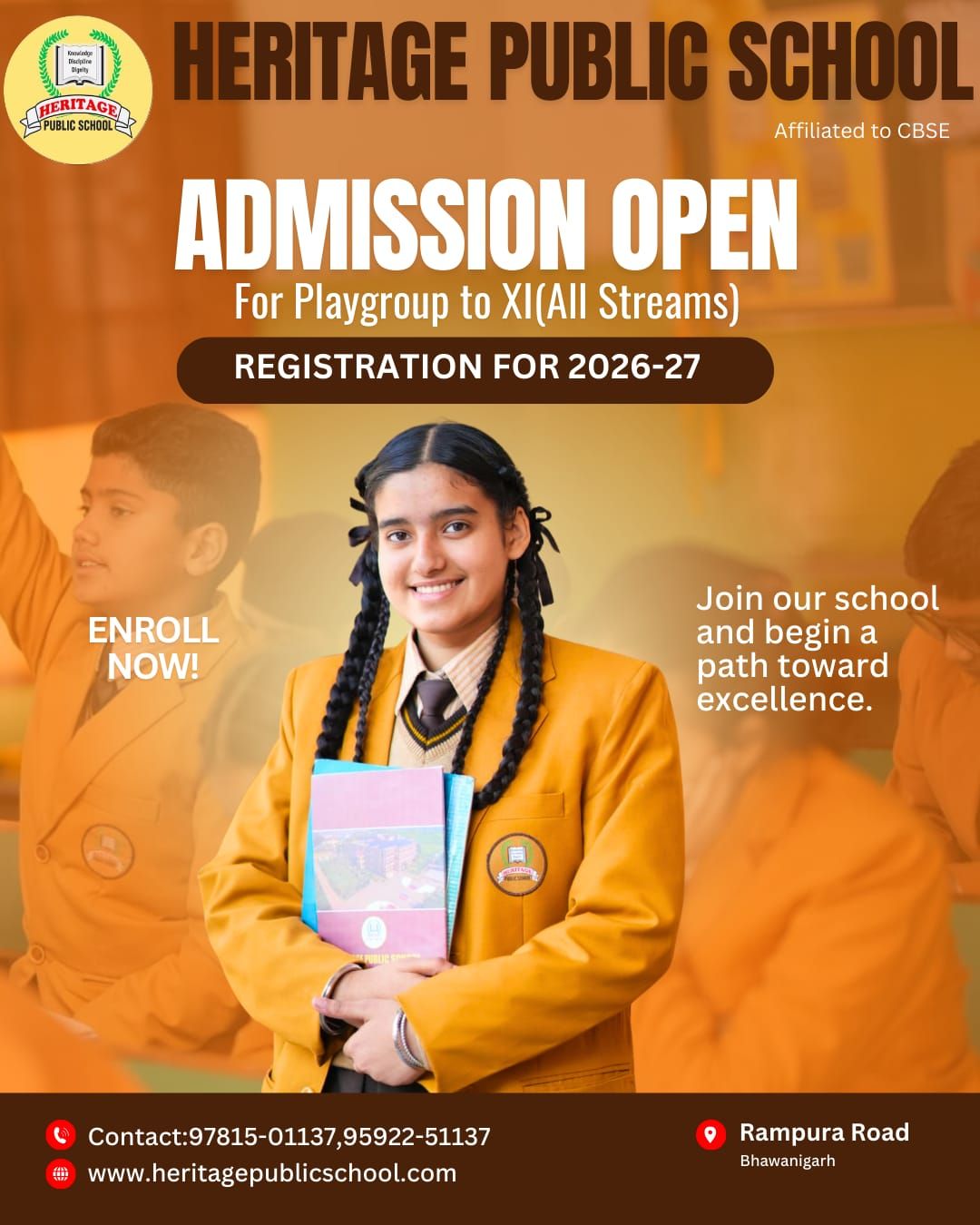 Heritage Public School Bhawanigarh, Rampura is known for its CBSE-based quality education, modern infrastructure, and student-centered learning approach. Our air-conditioned classrooms, smart classes, and well-equipped Science, Math, Language, and Computer Labs create an advanced academic environment. We focus on discipline, moral values, and holistic development through academics, sports, and co-curricular activities, ensuring every child grows into a confident and responsible individual.